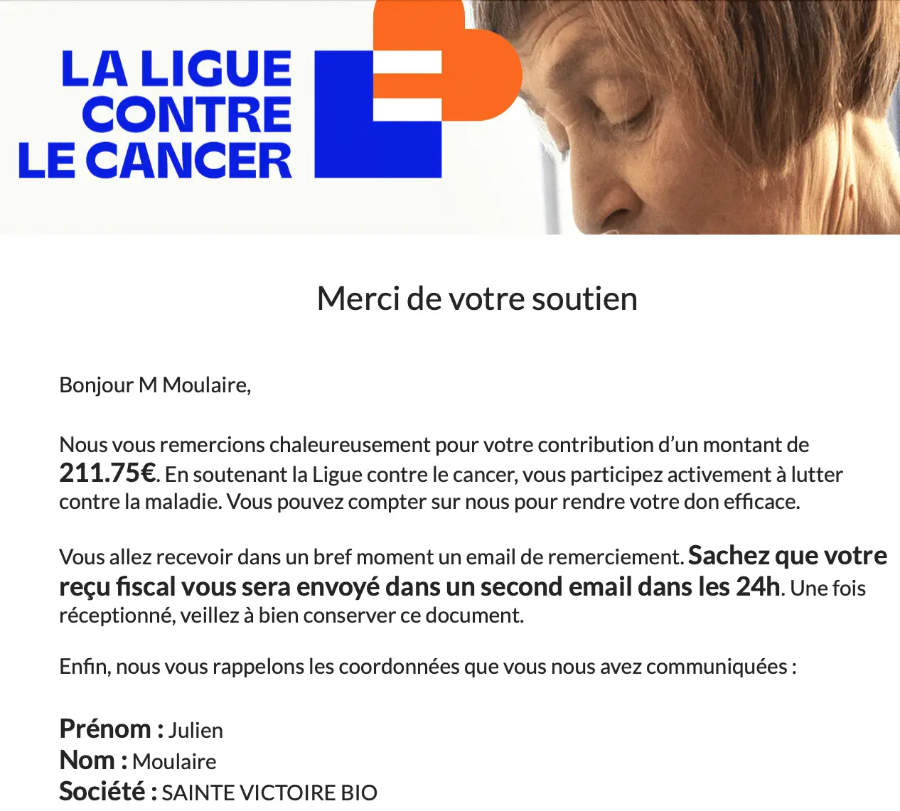 Grâce à votre action, nous avons fait un don de 211,75€ à la Ligue Contre le Cancer.